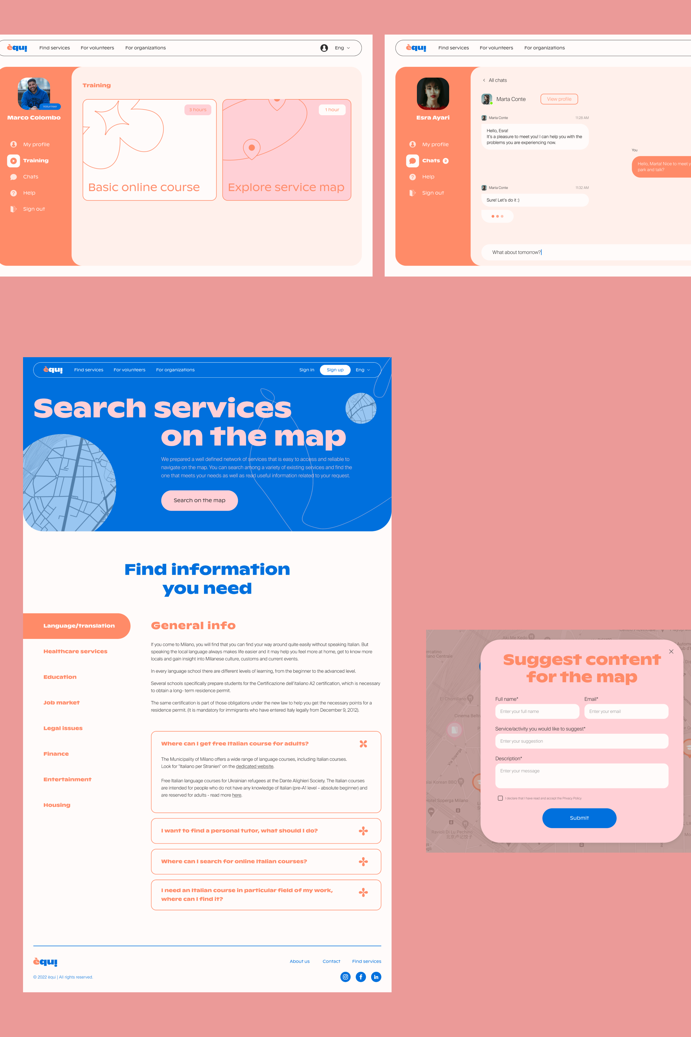 The website is designed in such a way that users can quickly access the map and search for local services that meet their needs, as well as suggest new services to add to the map. In addition, the èqui platform serves as a way to connect our main target groups — volunteers can be matched with a person in need and/or an organisation where the volunteer work is needed.