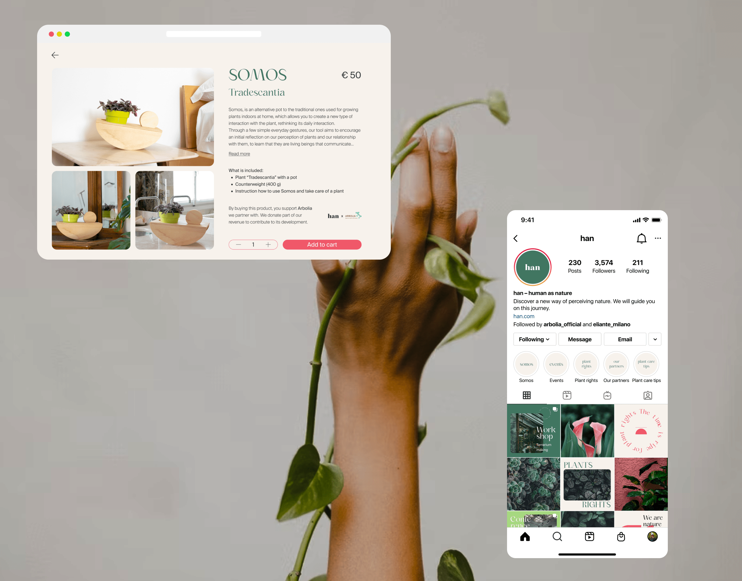 Our tone of voice is impactful, resilient, and friendly. We do not intend to make people feel guilty or promote a romantic and naive view of our relationships with nature but, on the contrary, make them think about and be aware of possible ways of change and actions they can take on a daily basis. Our voice is reflected in the slogans associated with the product advertising, in the typology of posts on social media and in the aesthetics of our website. All these touch points are characterized by simple phrases and graphics that intrigue users as they want to lead to a reflection on the issues we care about. Advertising through posters, flyers, etc. is more focused on raising awareness of Han and Somos, while social media are used primarily to promote collaborations and initiatives.